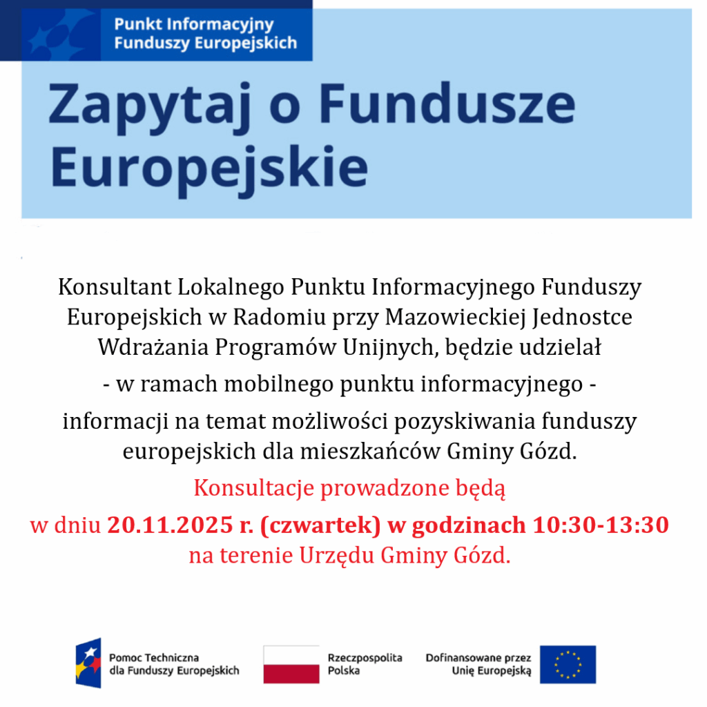 Konsultant Lokalnego Punktu Informacyjnego Funduszy Europejskich w Radomiu przy Mazowieckiej Jednostce Wdrażania Programów Unijnych zaprasza mieszkańców Gminy Gózd na spotkanie informacyjne dotyczące możliwości pozyskiwania funduszy europejskich. Konsultacje prowadzone będą w dniu 20.11.2025 r. (czwartek) w godzinach 10:30-13:30 na terenie Urzędu Gminy Gózd.