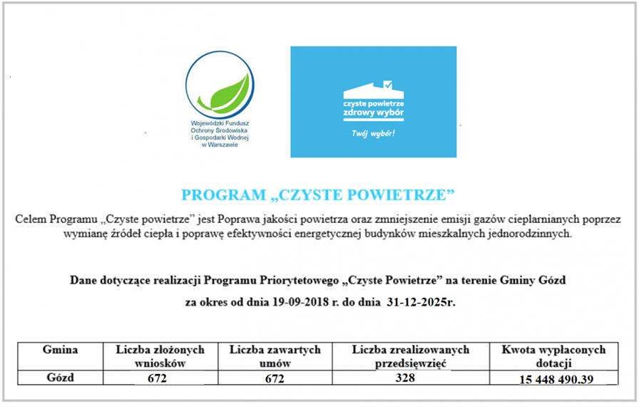 INFORMACJA 16 stycznia, 2026 admin prawe-boczne Możliwość komentowania INFORMACJA została wyłączona Gminny Ośrodek Pomocy Społecznej w Goździe przedstawia dane dotyczące realizacji Programu Priorytetowego „Czyste Powietrze” na terenie Gminy Gózd za okres od dnia 19.09.2018 r. do dnia 31.12.2025 r.
