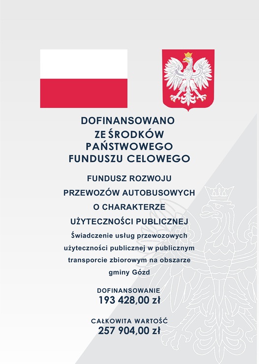 Świadczenie usług przewozowych użyteczności publicznej w publicznym transporcie zbiorowym na obszarze Gminy Gózd dofinansowano ze środków Państwowego Funduszu Celowego – Fundusz Rozwoju Przewozów Autobusowych o Charakterze Użyteczności Publicznej.