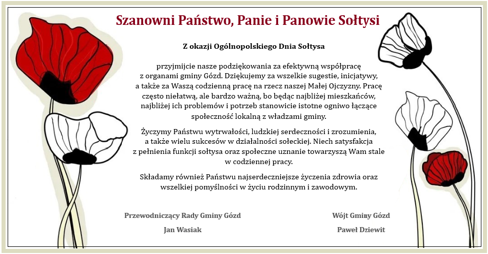 Szanowni Państwo, Panie i Panowie Sołtysi z okazji Waszego święta przyjmijcie nasze podziękowania za efektywną współpracę z organami gminy Gózd. Dziękujemy za wszelkie sugestie, inicjatywy, a także za Waszą codzienną pracę na rzecz naszej Małej Ojczyzny…
