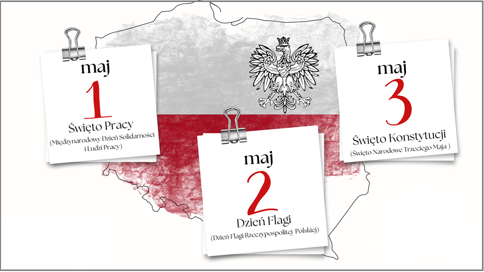 Świętując 1 maja (Święto Pracy), 2 maja (Dzień Flagi RP) oraz 3 maja (Święto Konstytucji 3 Maja), podkreślmy naszą tożsamość i jedność narodową. Wywieśmy biało-czerwoną flagę!